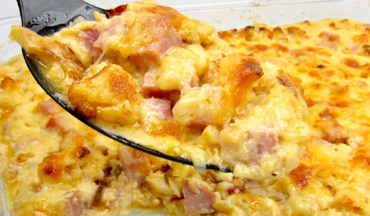 Rozłóż główkę kalafiora na kwiatostany, umyj i gotuj we wrzącej osolonej wodzie przez 5 minut. Następnie wymieszaj w głębokiej misce z pokrojoną w kostkę szynką i dopraw wszystko sosem ze śmietany, serka, tartego parmezanu, soli i pieprzu. Mieszankę wlej do natłuszczonej formy do pieczenia, posyp startym serem cheddar i piecz przez 30 minut w 180 stopniach.
