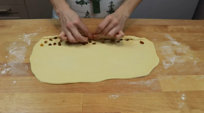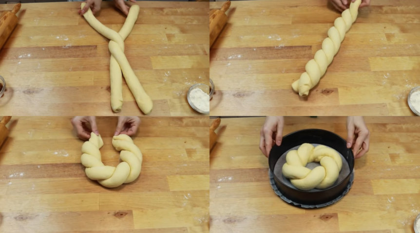 Następnie każdą połówkę rozwałkowujemy na cienki placek, na jeden brzeg układamy rodzynki i zwijamy w rulon. Następnie zwiń obie połówki ciasta w długi wąż, połącz gotowy warkocz w okrąg i umieść go w tortownicy wyłożonej papierem do pieczenia. Przykryj formę warkoczem folii i odstaw na kolejną godzinę.