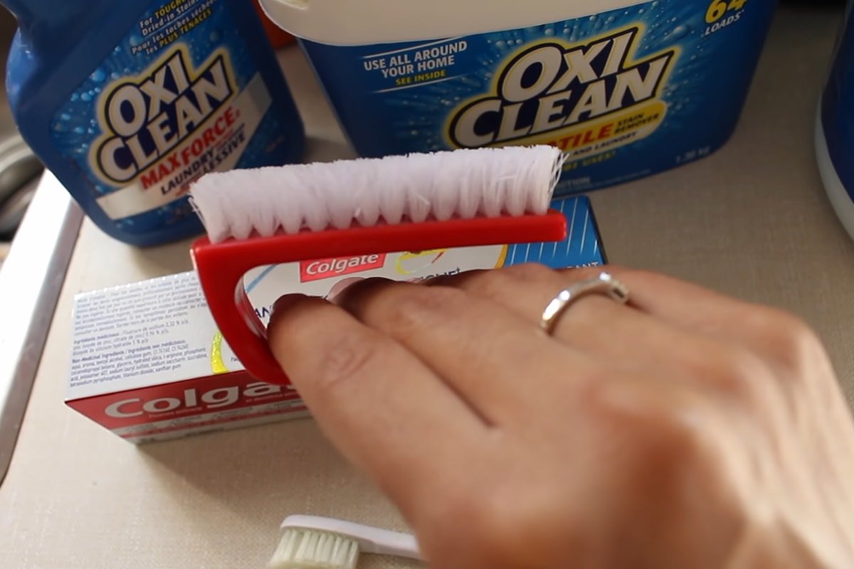 Posyp but odplamiaczem tlenowym w proszku. Następnie ponownie przetrzyj powierzchnię szczoteczką. Kolejno spłucz but wodą.
