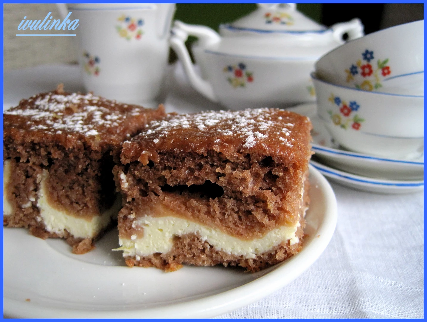 Ciasto serowe: W misce ubij jajka z cukrem i mąką na puszystą masę, a następnie dodaj pozostałe składniki w podanej kolejności. Otrzymamy gładkie i cienkie ciasto. Myjemy blachę do pieczenia, kładziemy na nią połowę ciasta kakaowego i wylewamy na nią ciasto twarogowe i resztę ciasta kakaowego. Pieczemy w temperaturze 170°C przez około 30 minut.