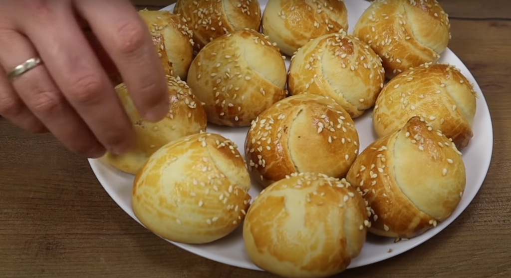 Ułóż bułeczki na blasze do pieczenia wyłożonej papierem do pieczenia. Posmaruj bułeczki olejem. Na koniec posypać ziarnami sezamu.