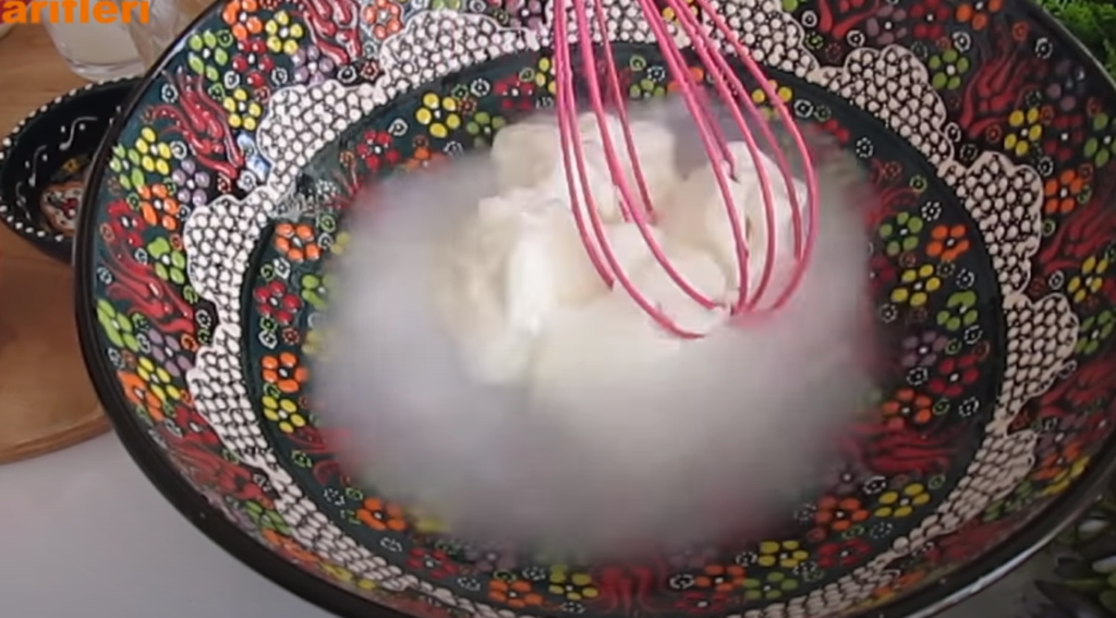 Do miski wrzuć biały jogurt i wymieszaj go z wodą i solą za pomocą trzepaczki. Mieszaj, aż jogurt i sól się rozpuszczą.
