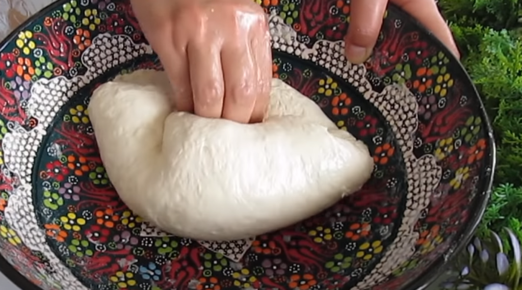 Następnie przetwarzamy całą mąkę, w tym proszek do pieczenia. Wypracujemy zwarte ciasto. Aby ciasto się nie sklejało, nacieramy je łyżeczką oleju roślinnego.