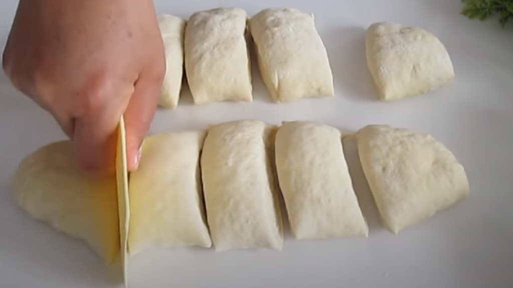 Następnie ciasto przekładamy na posypany mąką blat, dzielimy na dwie części, które odlewamy. Każdą część dzielimy na 5 mniejszych części.