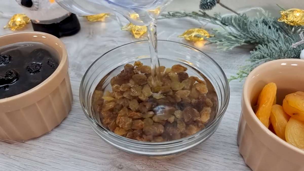 Orzechy można usmażyć na suchej patelni. Gdy ostygną, obierz je. W międzyczasie dodaj wodę do suszonych owoców.