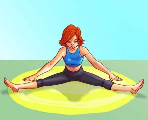 Wykonanie: usiądź wygodnie na ziemi, z wyprostowanymi plecami i jak najdalej tylko możesz połóż od siebie wyprostowane nogi. Podczas wdechu podnoś ręce nad głowę, także wyprostowane. Czas: 1 minuta, powtórz 8-10 razy. Efekt: likwiduje skurcze w pachwinie, wzmacnia plecy i kręgosłup, poprawia funkcje jajników, pobudza krążenie krwi w miednicy, zapobiega cellulitowi, reguluje miesiączkę.
