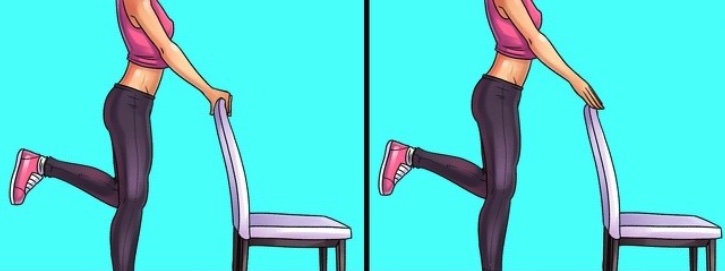 Stań za krzesłem i złap się za oparcie obiema rękami. Jedną nogę zegnij w kolanie i unieś do góry, tak żeby między łydką a udem powstał kąt prosty. Bardzo powoli unoś kostkę drugiej nogi, aż poczujesz, że cały ciężar Twojego ciała został przeniesiony na palce.