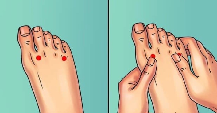 Jeśli po długim dniu odczuwasz ból stóp, to połóż swoje palce na tych punktach na stopach, które są zaznaczone na powyższym obrazku (pomiędzy 1 i 2 palcem oraz pomiędzy 4 i 5). Masuj delikatnie te miejsca przez 10-15 minut. Ćwiczenie to pozwoli Ci rozluźnić mięśnie kręgosłupa szyjnego.