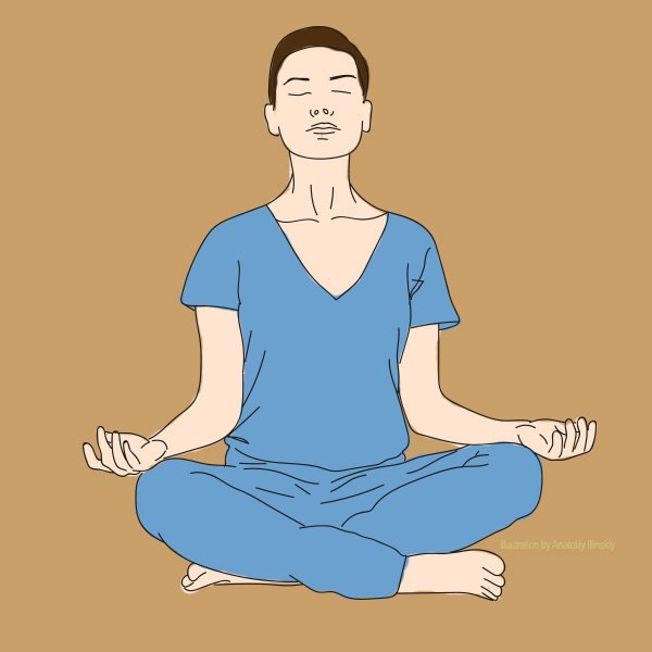 Usiądź w wygodnej dla Ciebie pozycji ze skrzyżowanymi nogami, następnie rozluźnij się oraz wyprostuj plecy. Wyciągnij szyję lekko do góry, jeżeli nie sprawia Ci to problemu, a dłonie oprzyj na skrzyżowanych nogach.