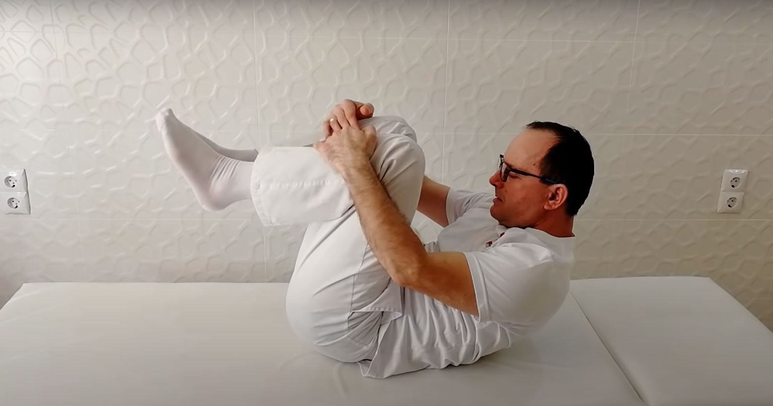 Ułóż się na plecach i rozłóż ramiona. Przyciągnij kolana do klatki piersiowej i obejmij ramionami. Wykonaj ok. 15-20 powtórzeń. Pamiętaj, żeby oddychać przeponą.