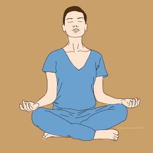 Usiądź w pozycji tureckiej, utrzymując kręgosłup i szyję w linii prostej. Wspieraj ręce na kolanach. Oddychaj spokojnie, relaksując się.