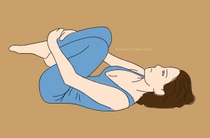 Z rękoma wyciągniętymi przed siebie, przyciągnij lewą nogę do klatki i obróć ciało w prawą stronę, nie odrywając dłoni od podłoża. Odczujesz ulgę w okolicach kości ogonowej.