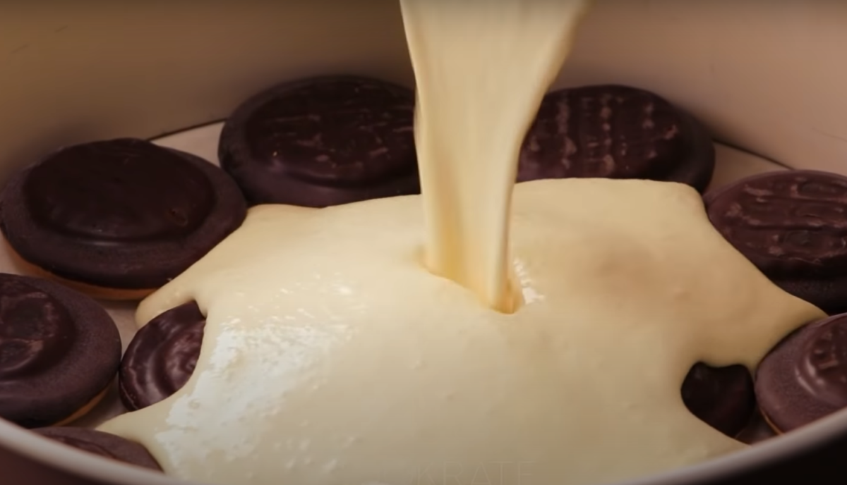 Niezwykle pyszny sernik, który raz dwa zrobisz: Po prostu wkładam Delicje do formy i wylewam ciasto twarogowe.