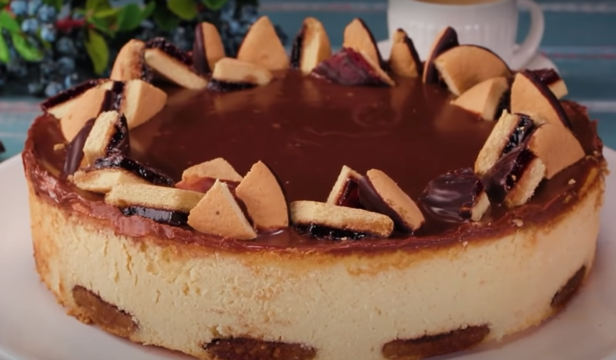 Następnie polej nią całą powierzchnię ciasta. Udekoruj ciasto pokrojonymi ciastkami.