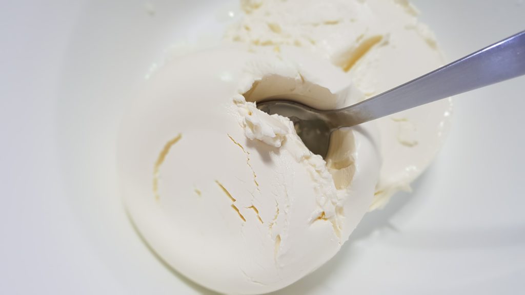 W osobnym naczyniu przygotuj krem. W tym celu dodaj do miski mascarpone i jogurt i wymieszaj. Dodaj cukier puder i ubij krem.