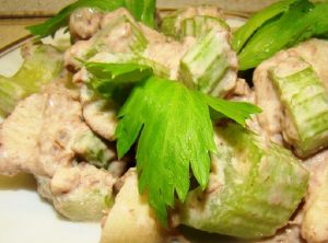 W pierwszej kolejności należy rozgnieść tuńczyka za pomocą na przykład widelca. Następnie należy go wymieszać z selerem naciowym i doprawić: oliwą z oliwek, sokiem z cytryny oraz pieprzem. Danie jest gotowe.