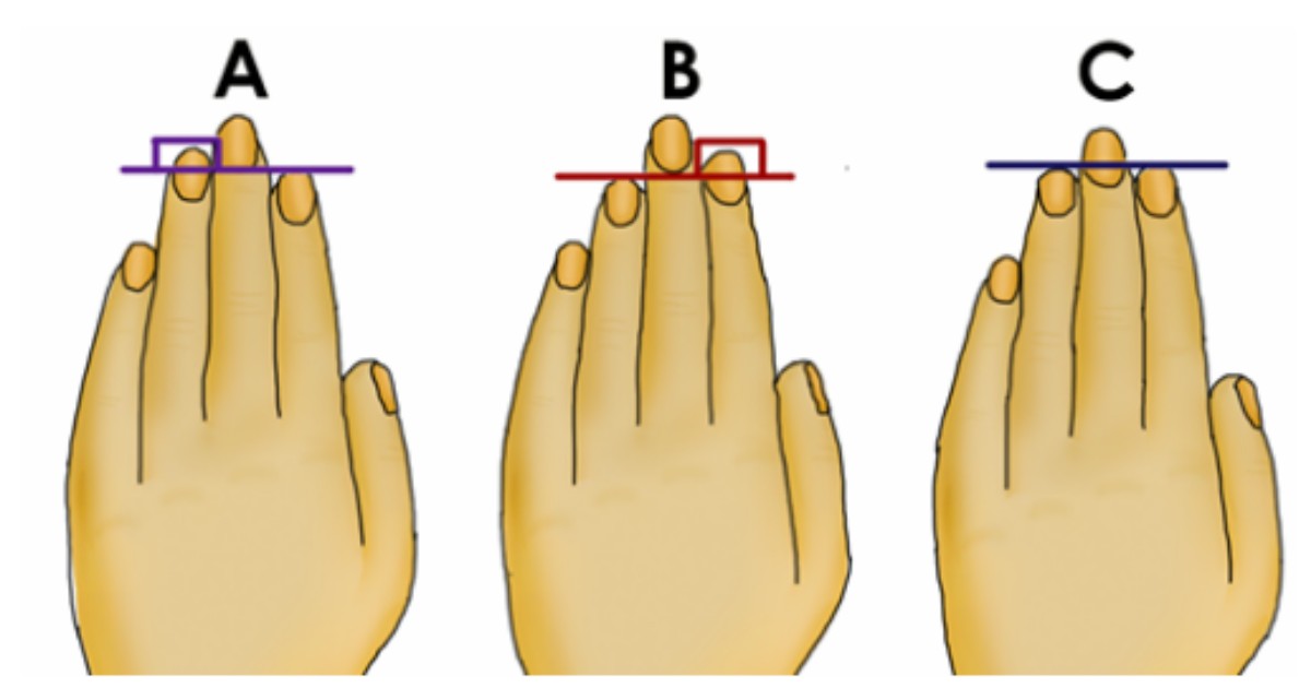 Aby odkryć co Twoja lewa dłoń chce Tobie przekazać, wystarczy ją wyprostować i sprawdzić położenie końca palca serdecznego w odniesieniu do palca wskazującego.