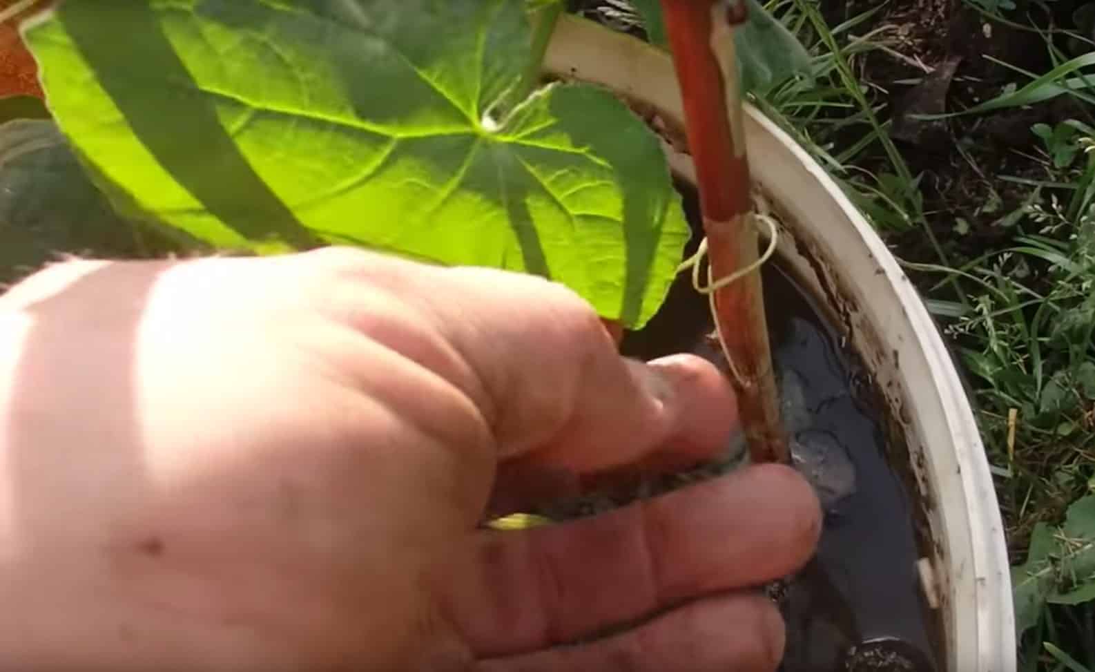 Owiń wąsy ogórka dookoła patyków. Kiedy woda całkiem wsiąknie, dodaj troszkę więcej ziemi – do samej krawędzi wiaderka.