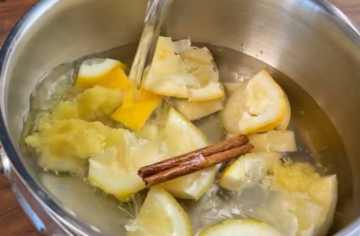Zacznij od umycia cytryny, przekrój ją na pół, wyciśnij sok i zachowaj go na później. Cytrynę pokrój w kawałki. Imbir obierz i zetrzyj na tarce, a następnie umieść w garnku razem z kawałkami cytryny. Wlej do garnka wodę, dodaj laskę cynamonu i gotuj wszystko, aż zawrą.