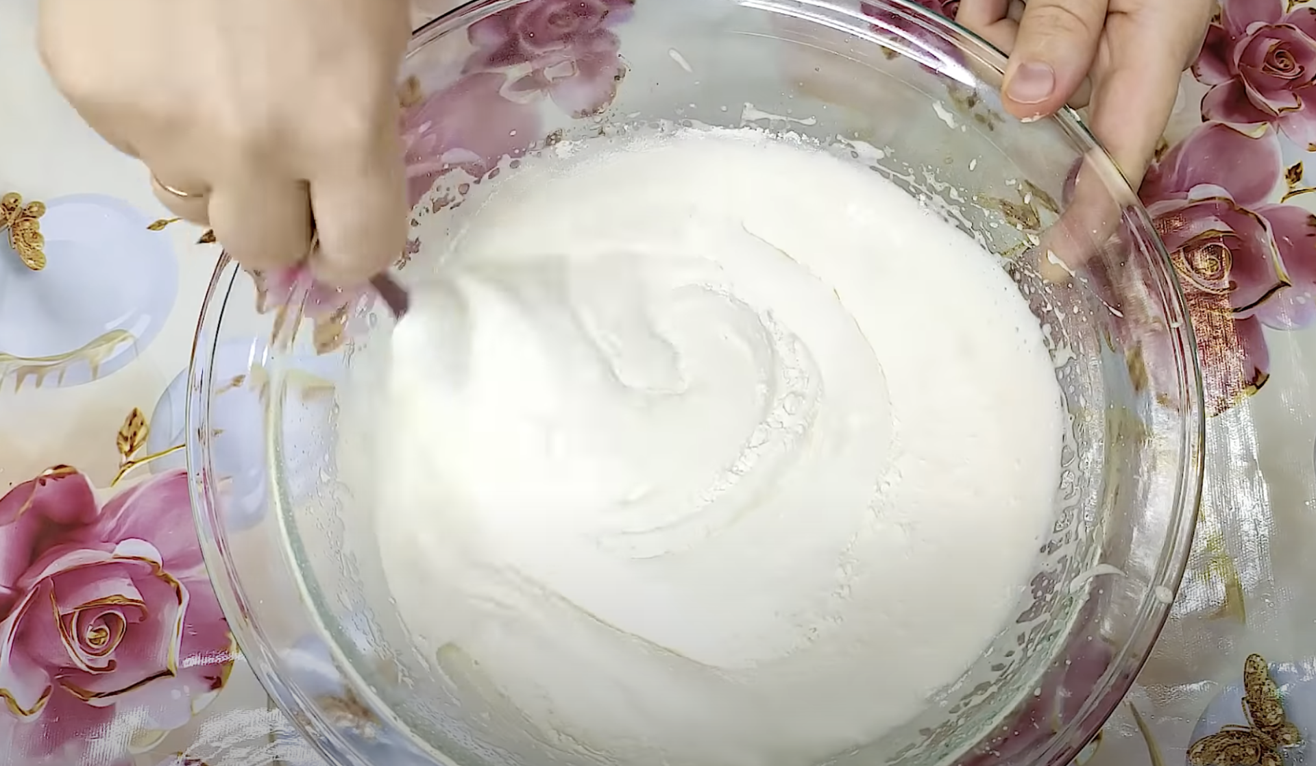 Jajka mieszamy z cukrem i dodajemy wanilię. Następnie ręcznie mieszamy mąkę z proszkiem do pieczenia.