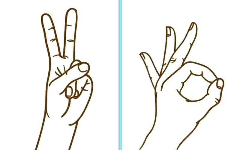 Prawą ręka wykonaj znak zwycięstwa „V,” a lewą znak „OK.” Teraz szybko zamień ręce, lewą ręką robiąc „V,” a prawką „OK.” Zmieniają symbole tak szybko, jak jesteś w stanie, starając się przyspieszyć.