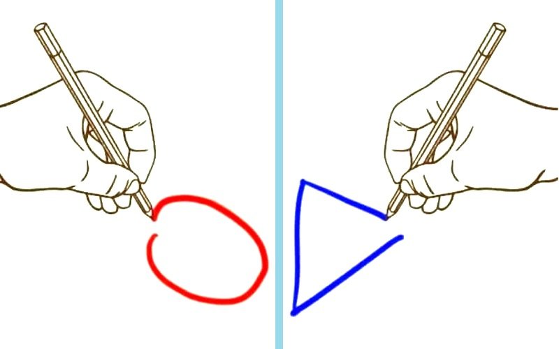 Prawą ręką narysuj okrąg, a lewą trójkąt. Możesz zdecydować się na pisanie liter lub całych słów (ważne, by oba słowa miały taką samą ilość liter).