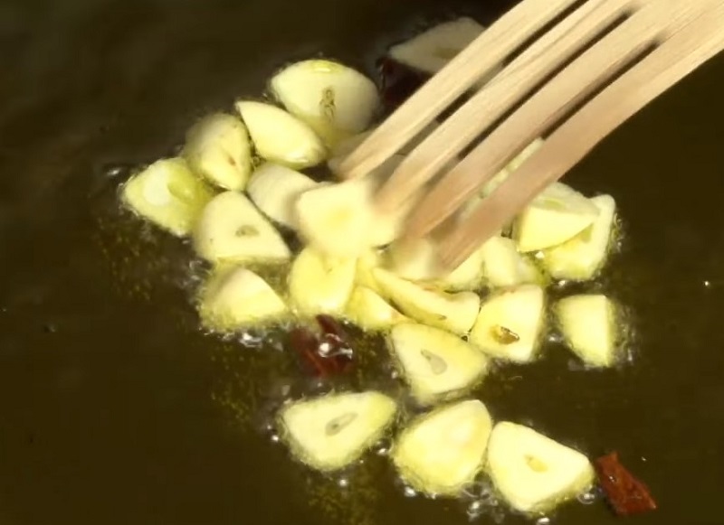 Pokrój papryczkę chili, obrany czosnek oraz grzyby. Patelnie rozgrzej, nalej oliwy z oliwek, tak aby przykryła ona dno. Na patelnię włóż czosnek oraz paprykę i smaż około minutę.