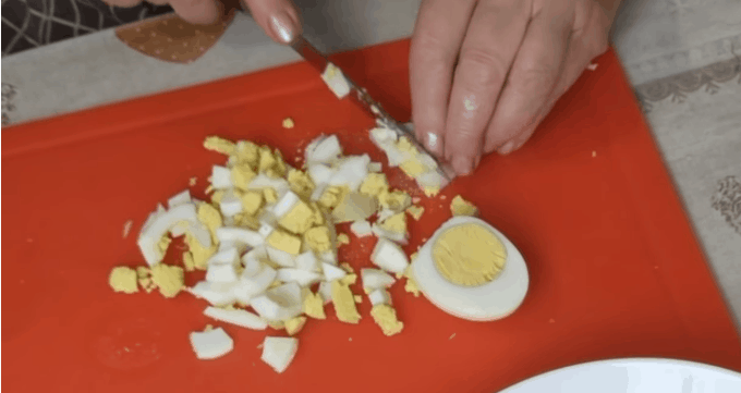 Do miski dodać jajka i pokrojony w kostkę seler naciowy. Doprawić według uznania.