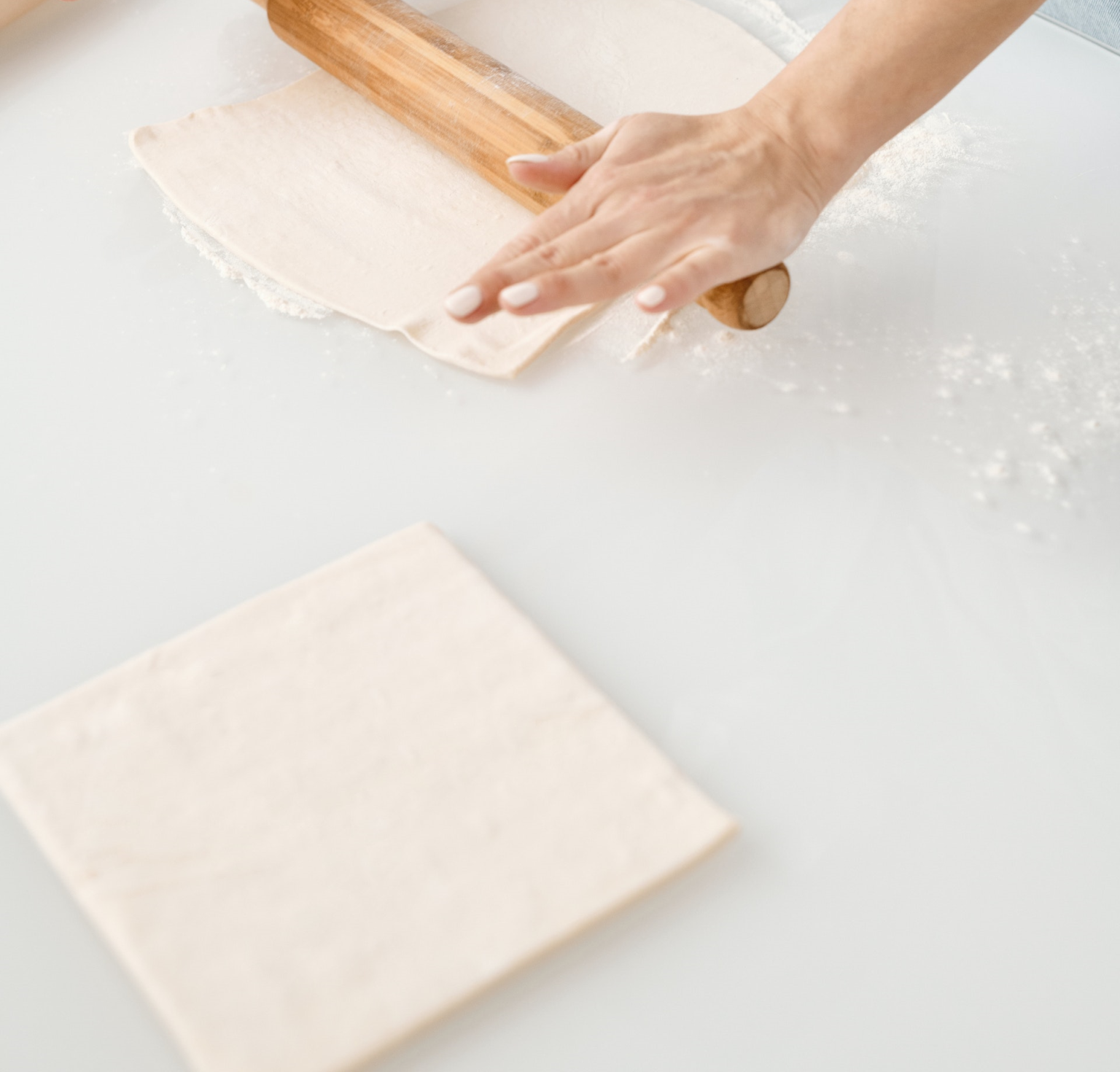 Dokładnie wygładzamy. Za pomocą wałka możemy pokroić ciasto na kwadraty.