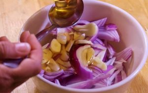 Rozpocznij od przygotowania cebuli oraz czosnku – obierz je, a następnie pokrój; cebulę na cienkie półkrążki, a czosnek w plastry. Następnie umieść je w misce. Do cebuli i czosnku dodaj miód pszczeli. Pamiętaj, aby był to miód najwyższej jakości, najlepiej prosto od lokalnego pszczelarza.