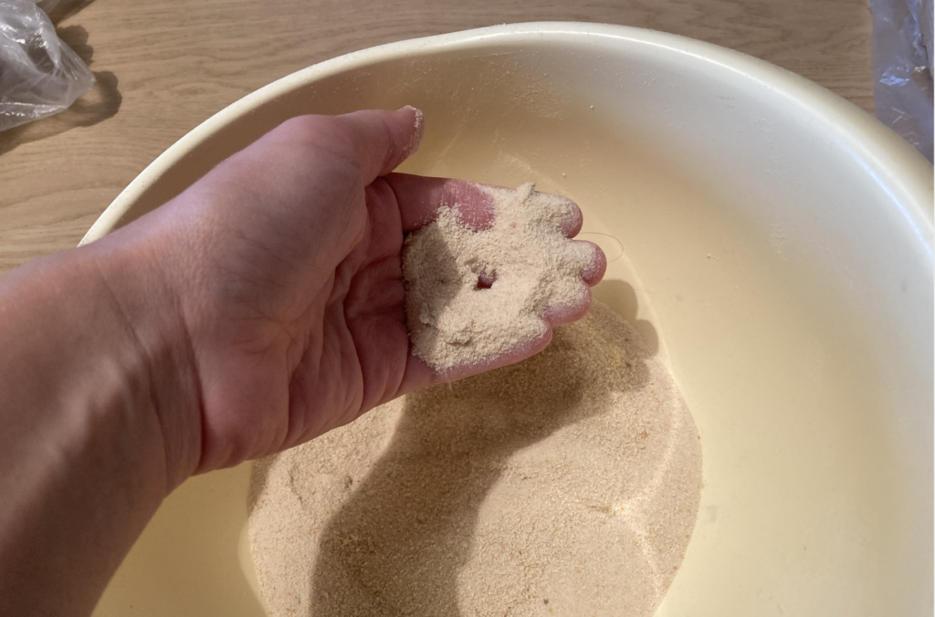 Najpierw pokrój chleb na kawałki. Następnie usuń z niego skórkę. Aby przygotować okruchy, wysusz skórkę chleba w piekarniku. Pozwól chlebowi ostygnąć w piekarniku przez kilka minut, zanim dodasz wodę lub mleko do miękkiego środka.