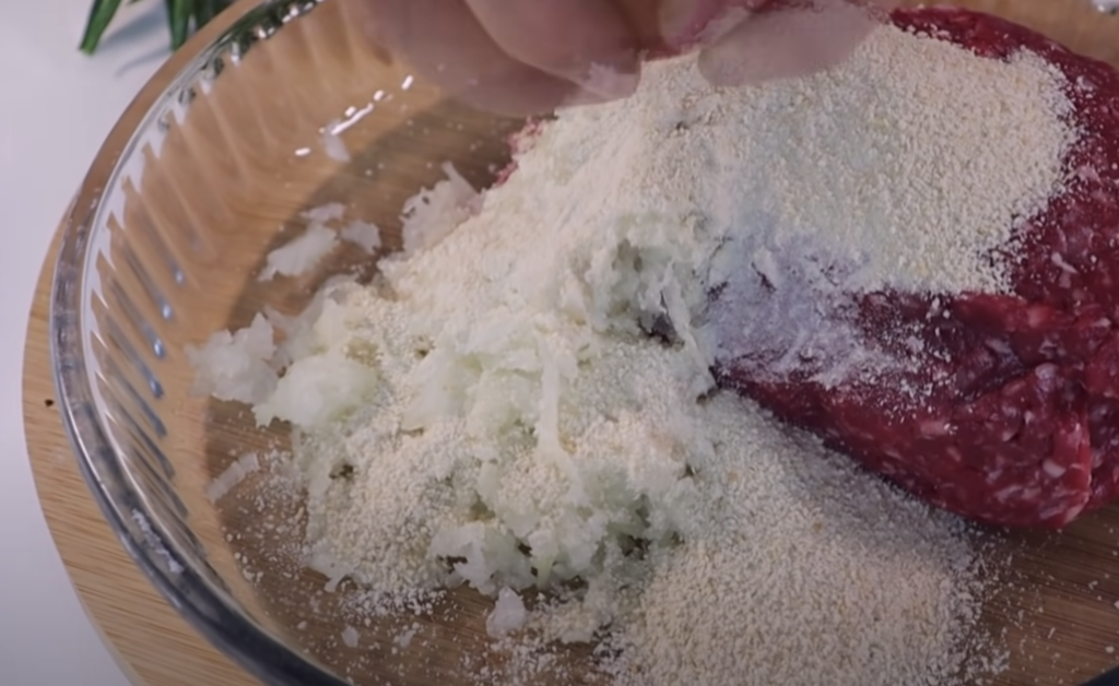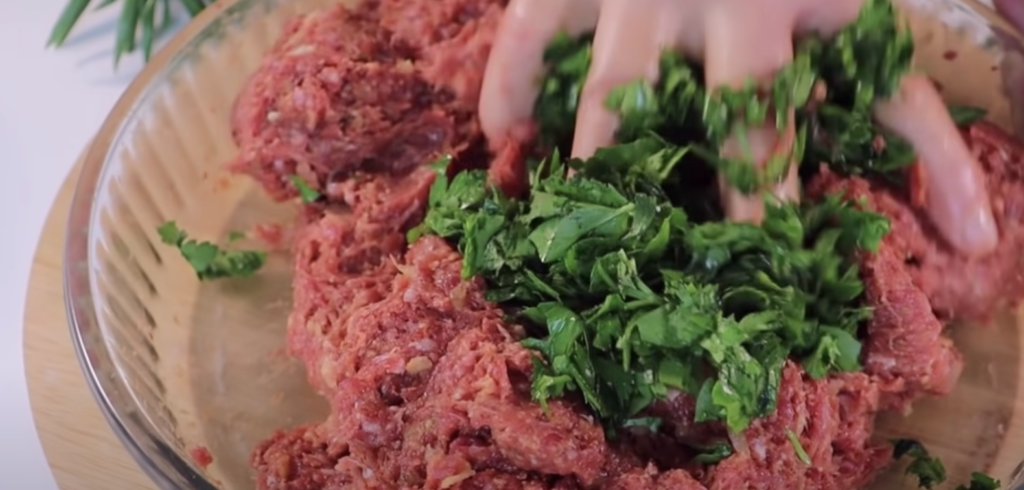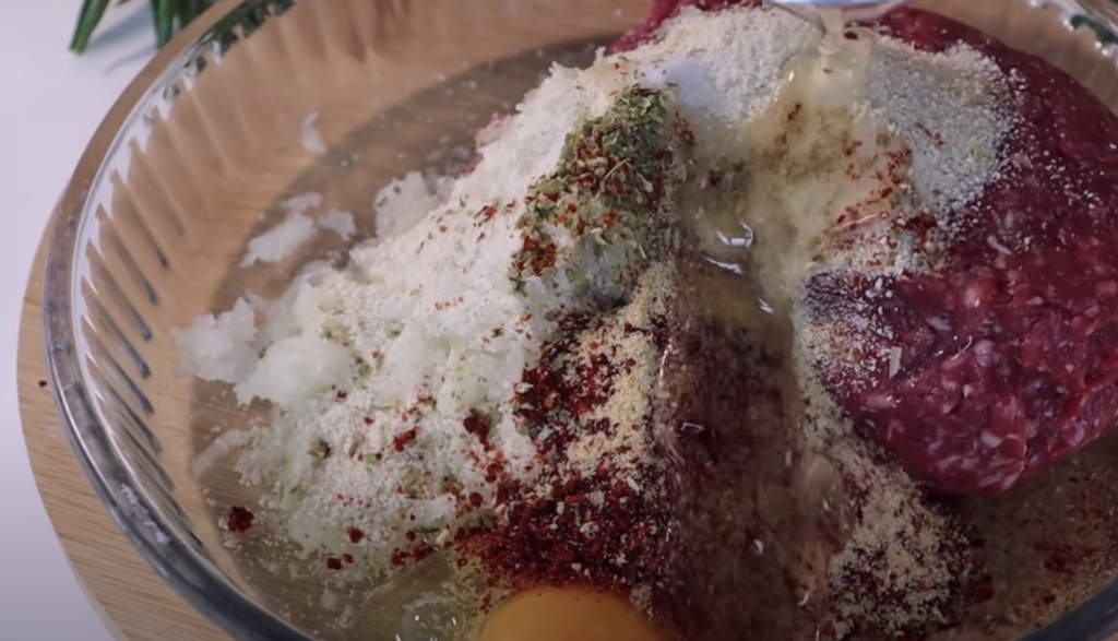 Najpierw przygotowujemy mięso mielone. Dopraw solą i przyprawami, dodaj drobno posiekaną lub startą cebulę, ser, bułkę tartą, olej.