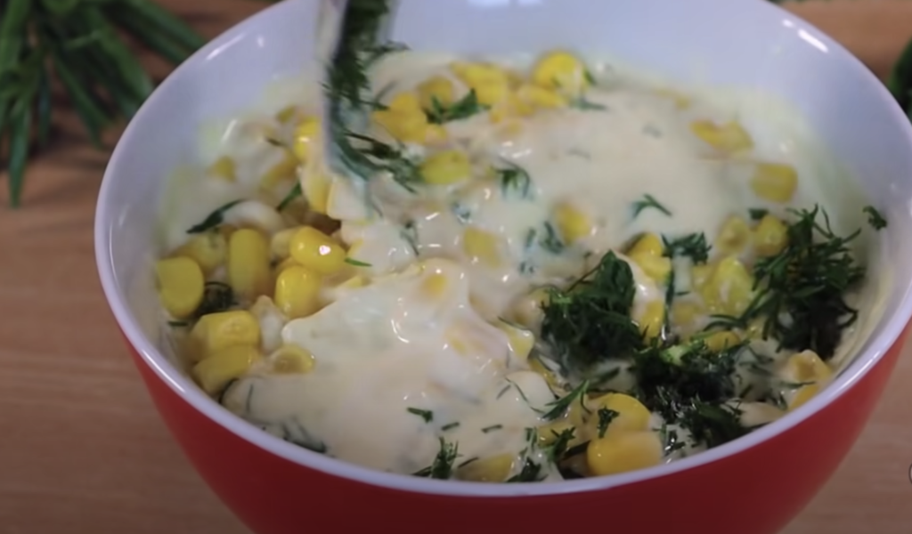 Aby przygotować sos mieszamy wszystkie składniki – jogurt, przyprawy, musztardę, zioła i kukurydzę.