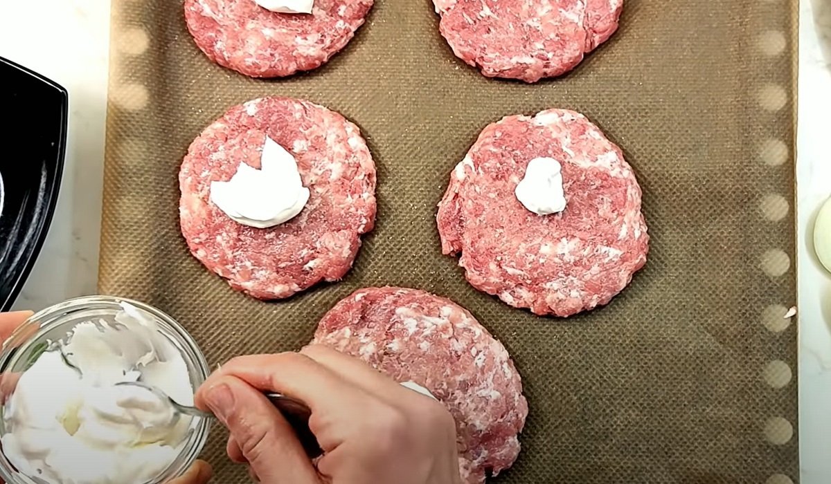 Uformuj z mięsa okrągłe płaskie kotlety i ułóż na blasze do pieczenia wysmarowanej tłuszczem. Na każdym kotlecie umieść łyżeczkę majonezu – to zabezpieczy mięso przed wysuszeniem.