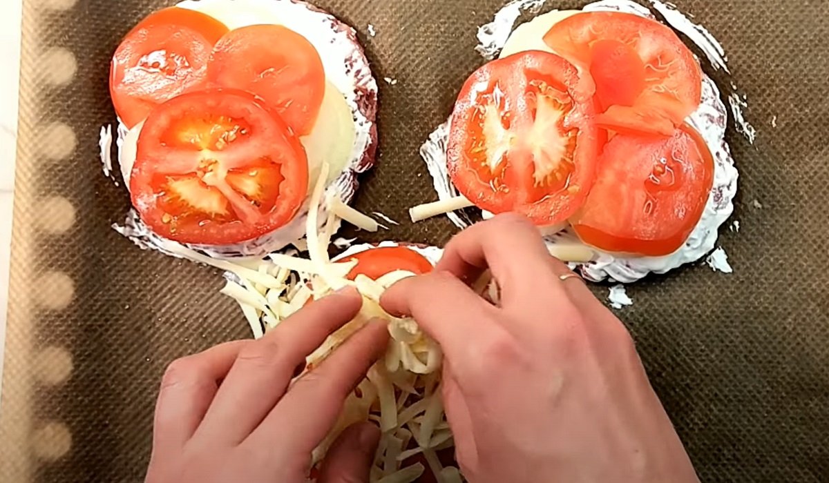 Pokrój pomidory i pozostałą cebulę w plastry. Na kotletach układaj najpierw krążki cebuli, potem pomidora. Kotlety posyp startym serem i zapiekaj w piekarniku przez 30 minut w 180 stopniach.
