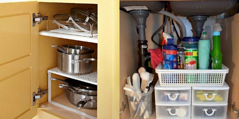Skorzystaj ze wszystkich dostępnych przestrzeni w kuchni. Zajmij szafki kuchenne w całej wysokości. Na rynku są dostępne wszelkie zawieszane organizery do mocowania na półkach czy też w szufladach.