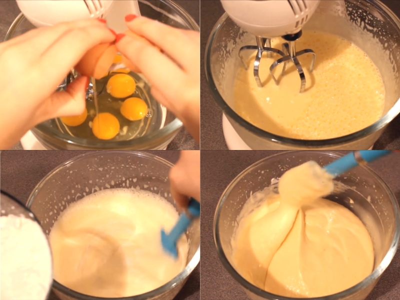 Mąkę, skrobię ziemniaczaną i proszek do pieczenia wymieszać w misce. Jajka rozbić w osobnym pojemniku, a następnie ubić je z dodatkiem gorącej wody aż do wytworzenia się bąbli na powierzchni masy jajecznej. Dodać mąkę i wszystko razem wymieszać już łyżką.