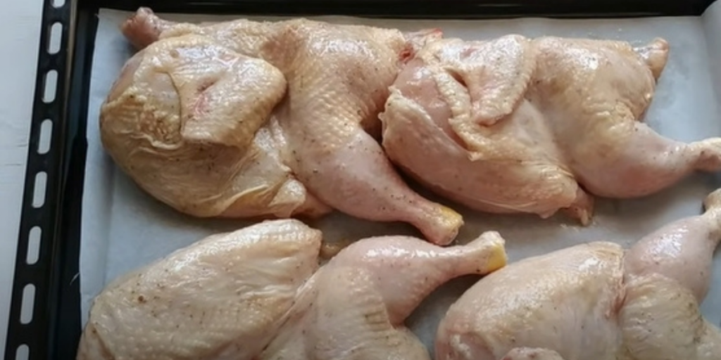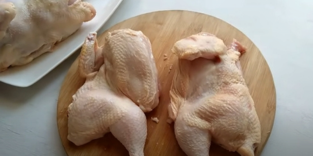 Dobrze umyj kurczaka, usuń końcówki skrzydeł oraz szyję. Następnie przekrój go na pół.