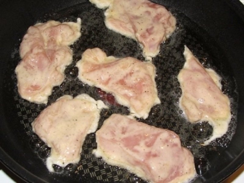 Jajka wbić do miski, roztrzepać, dodać przyprawy, podsmażoną cebulkę i dokładnie wymieszać. Mięso należy obtaczać po kolei w mące i mieszance cebulowo-jajecznej, dokładnie obsmażyć z obu stron do uzyskania złotego koloru.