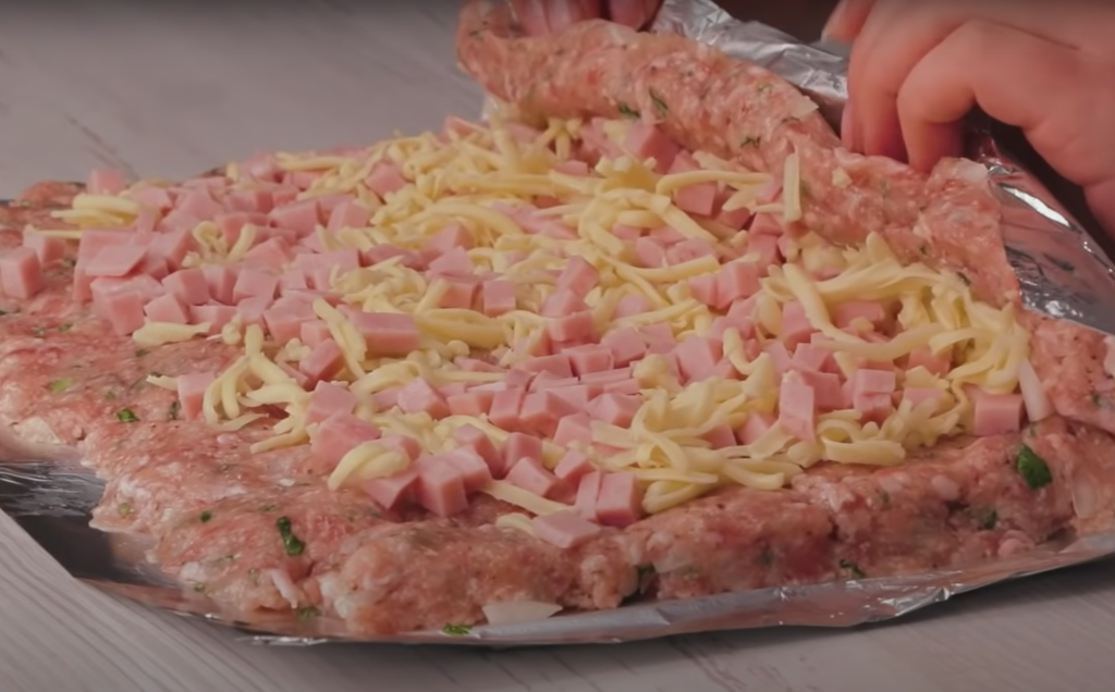 Ułóż masę mięsną na folii. Rozłóż na równym prostokącie. Przygotuj nadzienie: Szynkę pokroić w kostkę. Wymieszaj z grubo startym twardym serem. Na wierzchu ułóż mięso mielone. Zwijamy w rulon i zawijamy w folię.