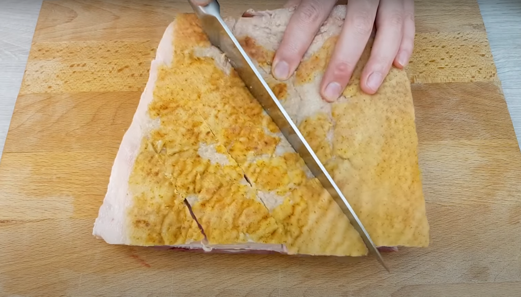 W pierwszej kolejności przygotuj odpowiednio boczek do marynowania. Możesz odkroić skórę lub ponacinać ją w kratkę. Nagrzej piekarnik do 180 stopni.
