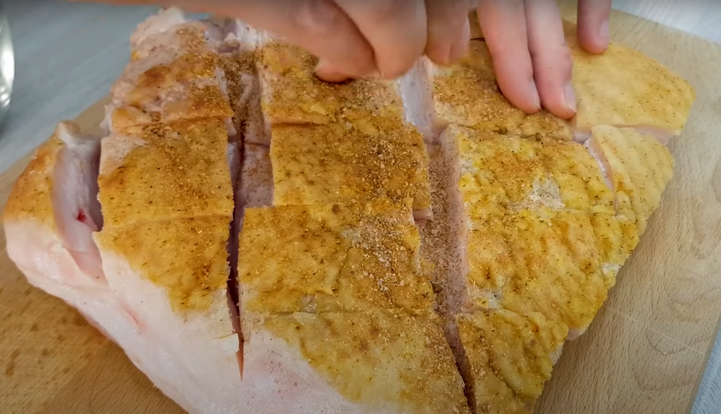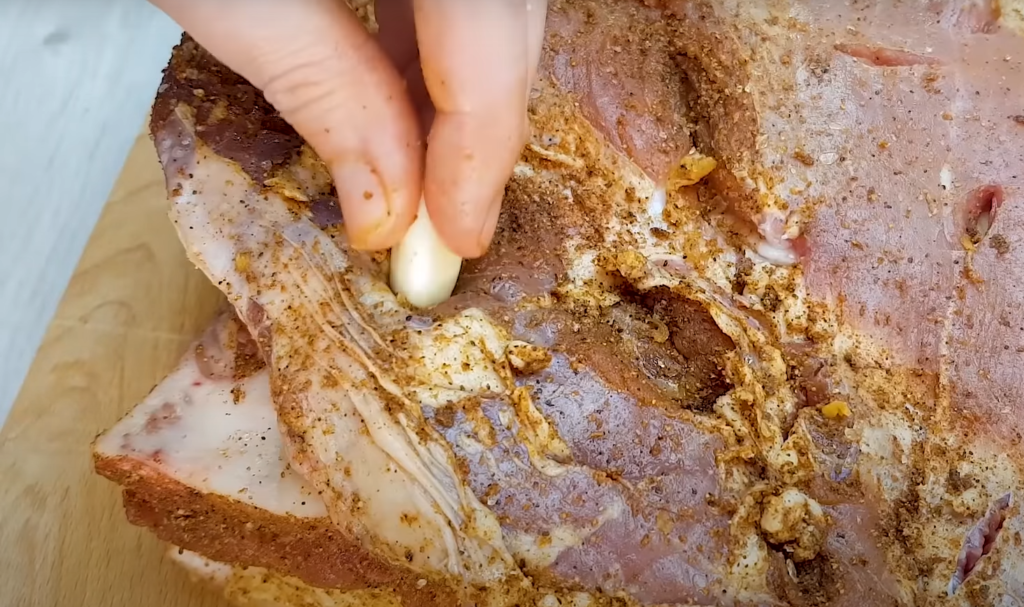 Przygotowany wcześniej kawałek mięsa natrzyj sporządzoną mieszanką przypraw. Mięso powinno być dokładnie pokryte przyprawami zarówno na zewnątrz jak i wewnątrz nacięć. Pozostały czosnek w ząbkach włóż do kawałka boczku nacinając lekko strukturę mięsa przy pomocy noża.