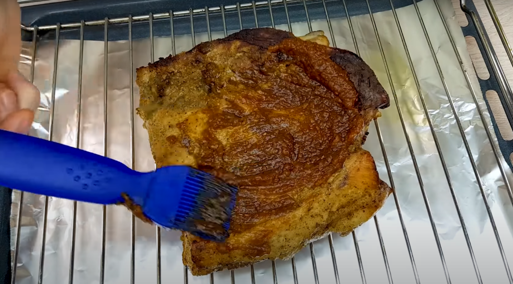 Po dwóch godzinach pieczenia wyjmij mięso z folii, nasmaruj marynatą, a następnie przełóż na grilla. Boczek grilluj około 5min w 220 stopniach.