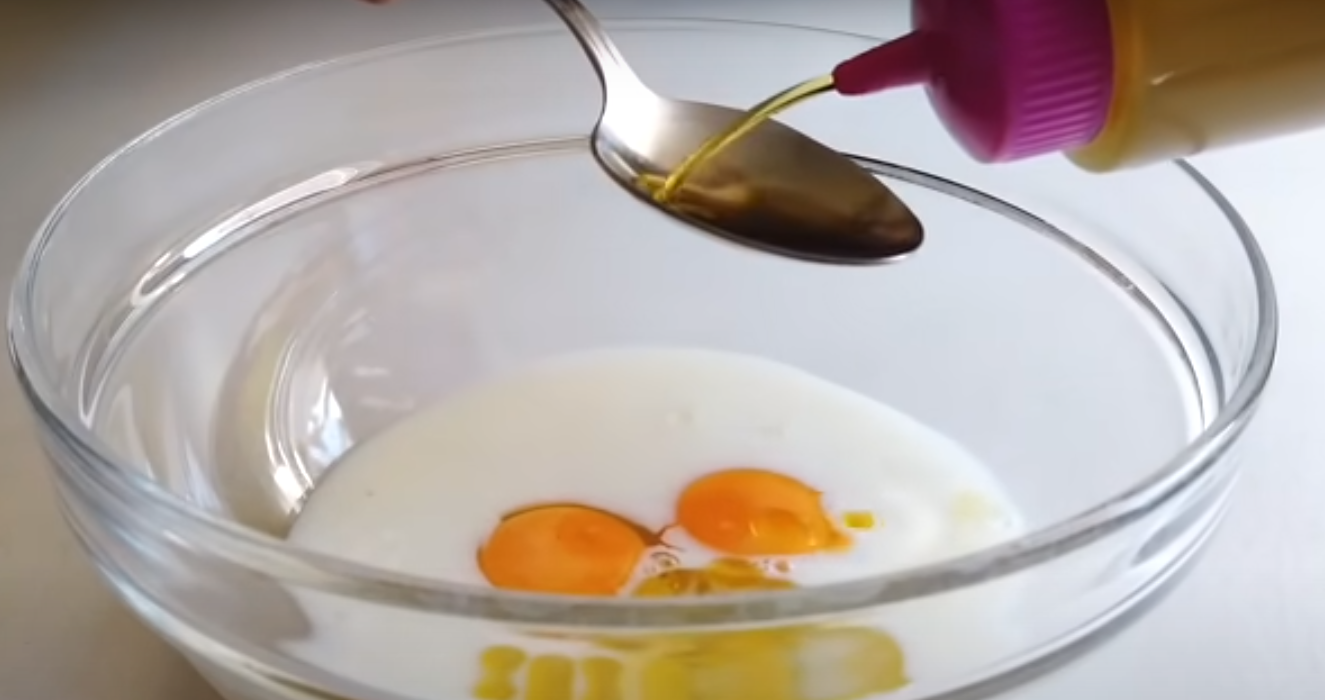Jajka rozbijamy do miski, wlewamy mleko i oliwę z oliwek. Dokładnie mieszamy.
