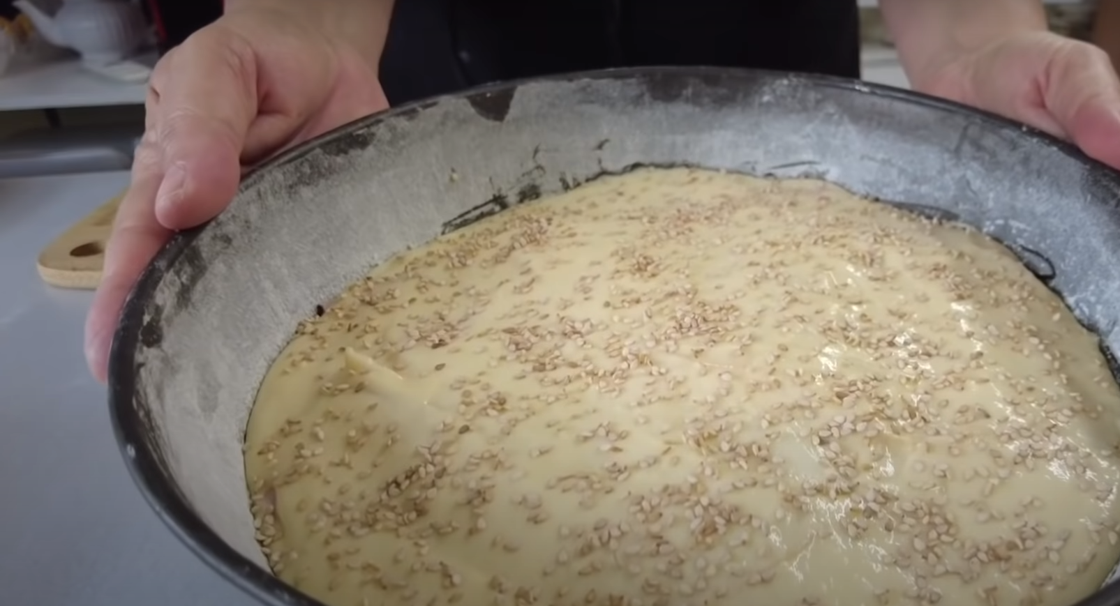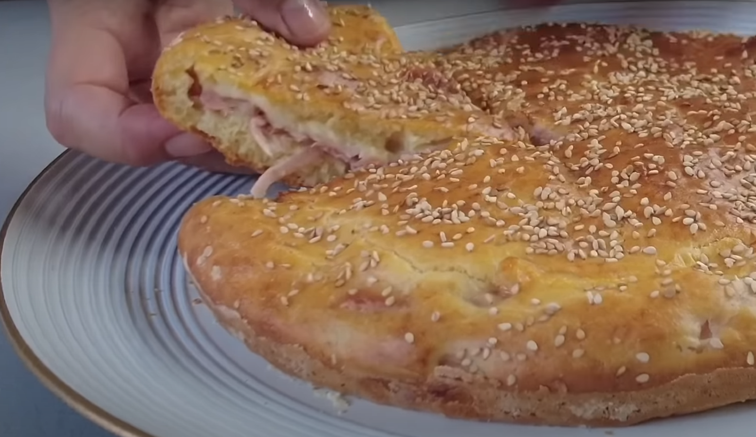 Połowę ciasta złożyć w okrągłą, wysmarowaną tłuszczem i posypaną mąką formę i równomiernie wygładzić.  Na ciasto położyć plastry szynki, plastry wędzonego sera i przykryć drugą częścią ciasta. Wierzch posyp sezamem.