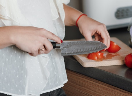 Bagietkę kroimy na cieńsze kromki. Następnie kroimy pomidora w kostkę i dodajemy do większej miski.
