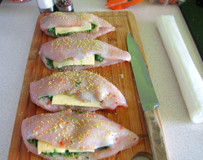 Następnie rozcinamy każdą z piersi kurczaka, ale nie do samego końca – ma powstać kieszonka, którą napełniamy przygotowanym wcześniej farszem. Do kieszonki, na nadzieniu, wkładamy także plasterek sera.