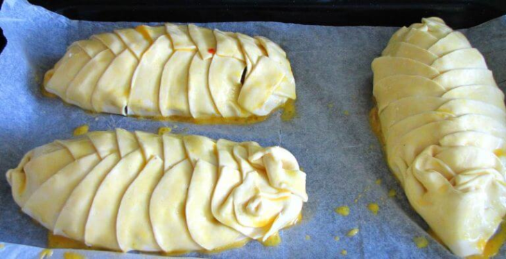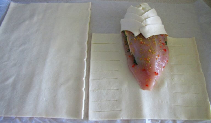 Długość pasków zależeć będzie od wielkości danej piersi – kładziemy ją na środku ciasta, musi pozostawać na nienaciętym kawałku. Musimy zawinąć pierś w ciasto, tak jak jest to pokazane na fotografii.