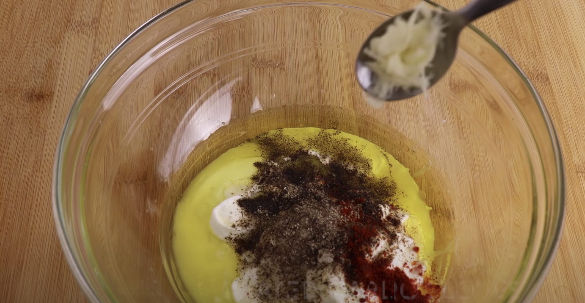 Dodaj kolejno: jogurt naturalny, oliwę, rozgnieciony czosnek, przyprawy i musztardę. Całość pomieszaj do uzyskania jednolitej konsystencji.