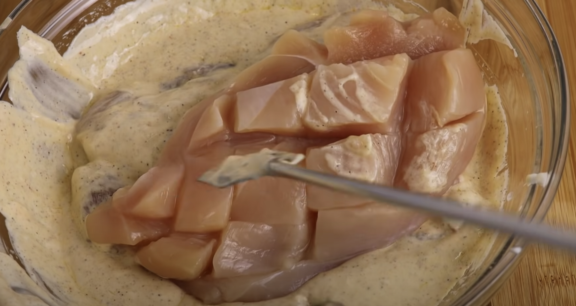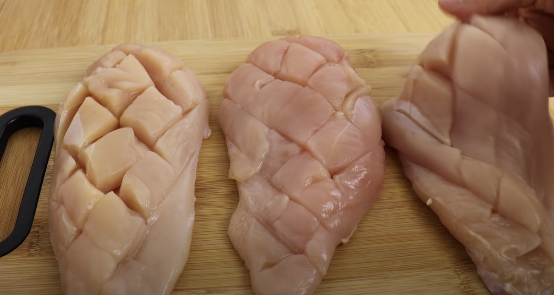 Umyj piersi z kurczaka, osusz i ponacinaj w taki sposób, aby powstała na nich kratka. Uważaj by nie przekroić całkiem mięsa.